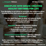 Discipline becomes damaging when it is fueled by guilt or perfectionism, but life-giving when grounded in grace. God-centered discipline creates healthy rhythms—consistent patterns of rest, movement, prayer, and nourishment that support long-term wellness. Grace allows room for growth without condemnation, while discipline provides structure without rigidity. Together, they form sustainable habits that strengthen the mind, steward the body, and deepen spiritual alignment. Healthy rhythms free us from burnout and help us live intentionally, one faithful step at a time.